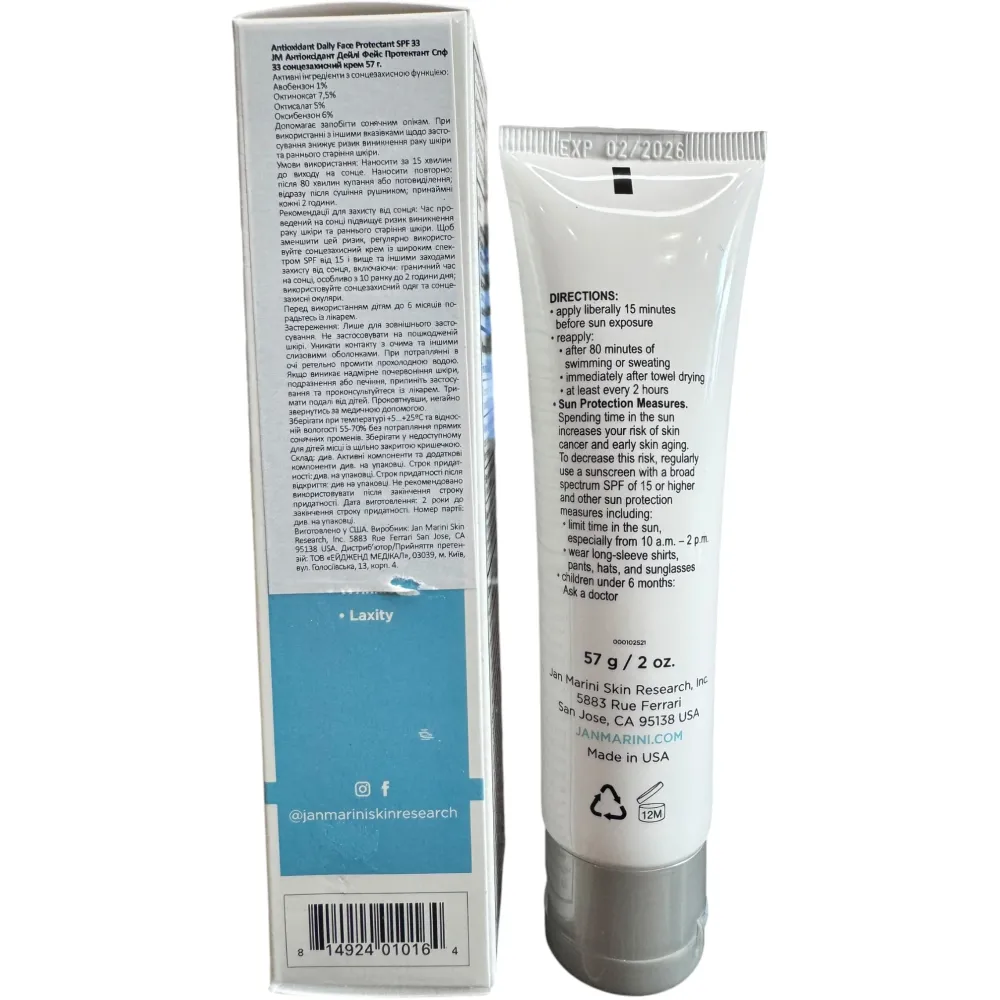 Антиоксидантный крем Jan Marini Antioxidant Daily Face Protectant SPF 33 – это крем непосредственно для защиты от ультрафиолета. А также он оказывает действенный антиоксидантный эффект, защищает от раннего старения кожи и увлажняет дерму. Antioxidant Daily Face Protectant SPF 33 дает непрерывное защитное покрытие, но при этом не забивает поры, так как текстура его – легкая, нежирная.