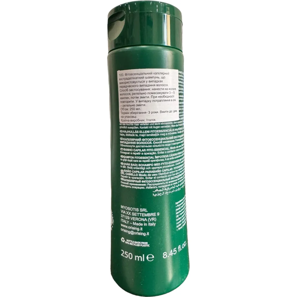 Orising Caduta Shampoo – фитоэссенциальное успокаивающее средство, которое препятствует выпадению волос. Шампунь укрепляет корни, питает волосяные луковицы и способствует росту здоровых волос. Также бережно очищает кожу головы, не повреждая структуру волосяного покрова, обладает смягчающим действием. Уникальность его формулы обеспечивает присутствие природных ингредиентов, экстракты мяты, крапивы и чабреца, которые позитивно влияют на восстановление структуры волос.