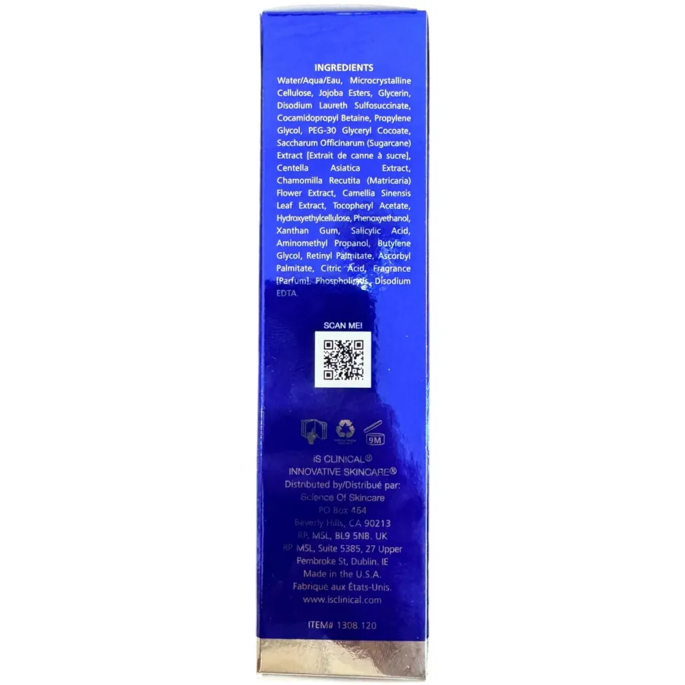 Water/Aqua/Eau, Microcrystalline Cellulose, Jojoba Esters, Glycerin, Disodium Laureth Sulfosuccinate, Cocamidopropyl Betaine, Propylene Glycol, PEG-30 Glyceryl Cocoate, Saccharum Officinarum (Sugarcane) Extract (Extrait de canne à sucre), Centella Asiatica Extract, Chamomilla Recutita (Matricaria) Flower Extract, Camellia Sinensis Leaf Extract, Tocopheryl Acetate, Hydroxyethylcellulose, Phenoxyethanol, Xanthan Gum, Salicylic Acid, Aminomethyl Propanol, Butylene Glycol, Retinyl Palmitate, Ascortyl Palmitate, Citric Acid, Fragrance (Parfum), Phospholipids, Disodium EDTA.