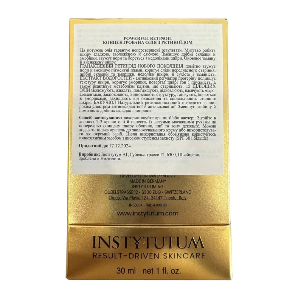 Масло с ретинолом Институтум делает кожу лица мягкой, нежной и бархатистой. Помогает уменьшить недостатки кожи: тусклый цвет, темные мешки под глазами, пигментные пятна. Кожа становится более свежей, сияет здоровьем целый день. В холодное время года использовать утром и вечером. Масло выравнивает текстуру кожи, обеспечивая ей глубокое питание.