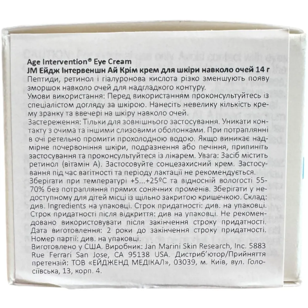 Крем для век с пептидами Jan Marini Age Intervention Eye Cream – это заметно и стойко корректирующий деликатную зону продукт. Крем укрепляет зону вокруг глаз, увлажняет там дерму, смягчает и разглаживает. Показан крем непосредственно для применения в зоне вокруг глаз, однако подходит и для кожи губ. Типы дермы, при которых можно применять данный продукт, это:
