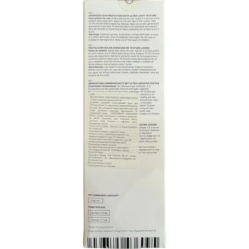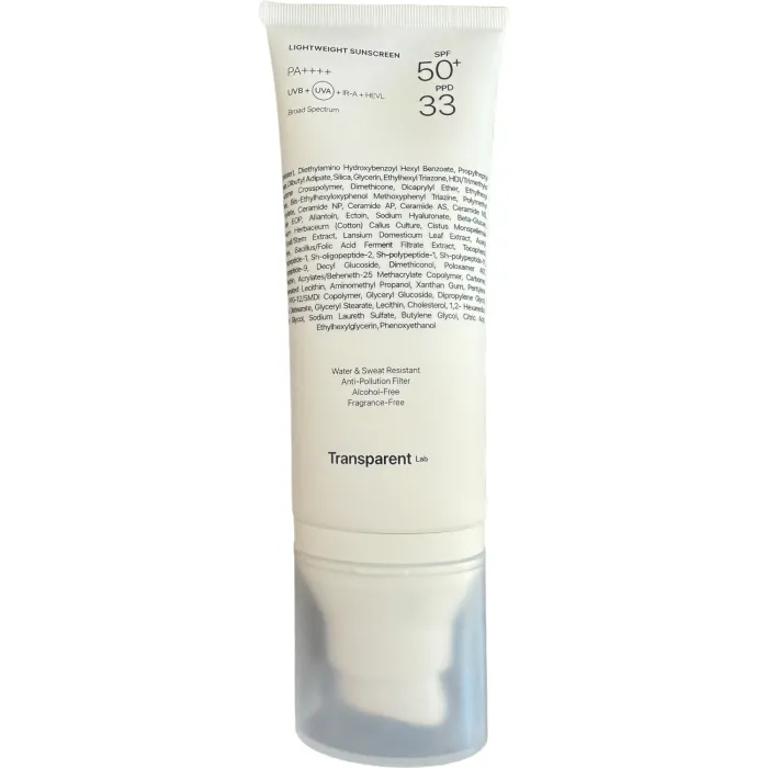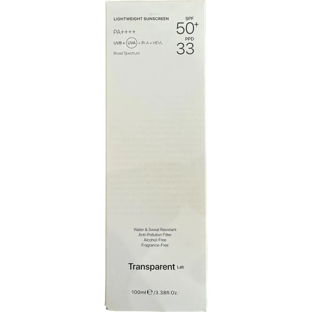 Transparent Lab Lightweight Sunscreen SPF 50+ — лёгкий солнцезащитный крем с высокой степенью защиты от UVA/UVB. Не забивает поры, не оставляет белых следов и идеально подходит для ежедневного применения, в том числе под макияж. В составе: ниацинамид, витамин Е и антиоксиданты. Подходит для всех типов кожи, включая жирную и чувствительную.
