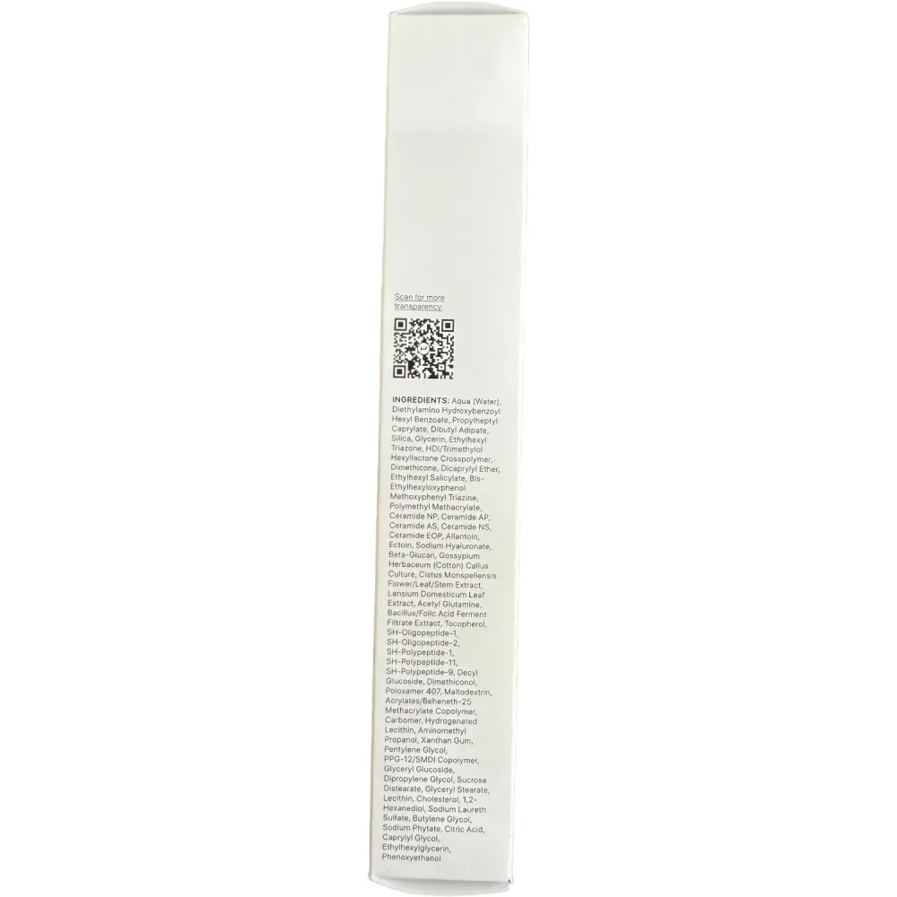 Вода, Диципропилкарбонат, Дибутил адипат, Глицерин, Салицилат этилгексила, Гомосалат, Октокрилен, Бис-этилгексилоксидиметоксибензилмалонат (BEMT), Бис-этилгексилоксифенол метоксипфенилтриазин (Tinosorb S), Динатрия фенилдубильная кислота дисульфонат, Пентиленгликоль, Пропандиол, Ниацинамид, Пантенол, Аскорбил глюкозид (витамин С), Токоферол (витамин Е), Экстракт зеленого чая, Экстракт корня солодки, Экстракт центеллы азиатской, Гиалуроновая кислота, Карбомер, Ксантановая камедь, Трометамин, Этилгексилглицерин, Феноксиэтанол.
