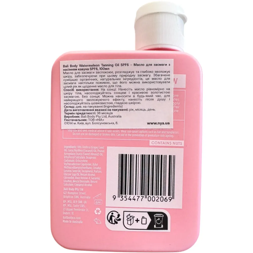 Bali Body Watermelon Tanning Oil SPF 6/15/50 — это летнее масло для загара с невероятным ароматом арбуза. Ваш маленький летний лайфхак, который помогает быстро получить красивый загар и ухоженную кожу. Оно создано для тех, кто любит загорать с умом и хочет сочетать бронзовый тон с увлажнением. Подходит всем типам кожи, особенно если есть склонность к сухости. Есть варианты защиты SPF 6, 15 или 50 — выбирайте подходящий уровень в зависимости от ваших планов и интенсивности пребывания на солнце