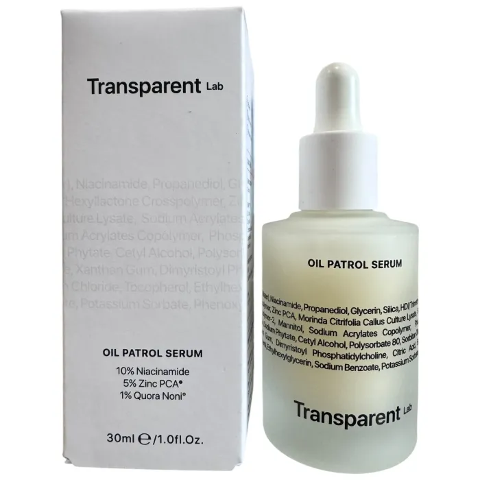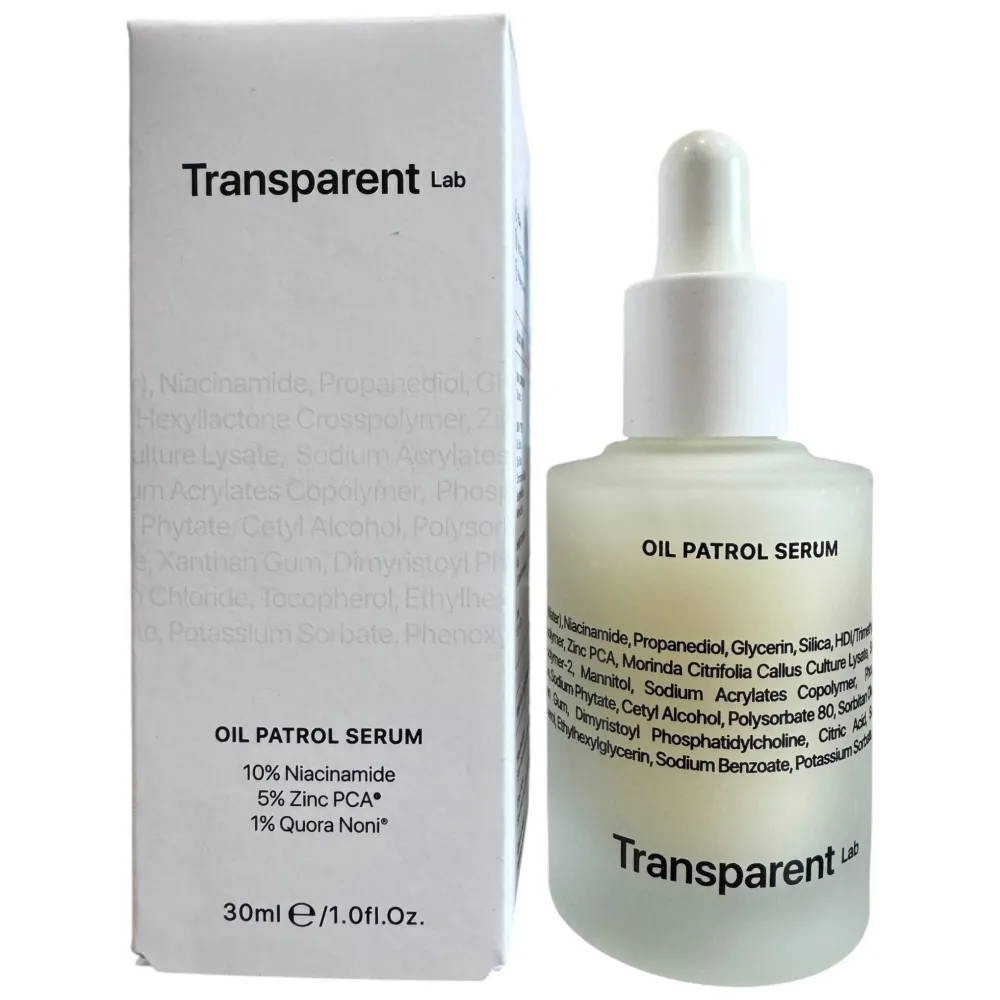 Transparent Lab Oil Patrol Serum — матирующая сыворотка с ниацинамидом и цинком для жирной и комбинированной кожи. Регулирует выработку себума, сужает поры и уменьшает воспаления. Обеспечивает матовый финиш без пересушивания. Идеальна для ежедневного ухода и как основа под макияж.