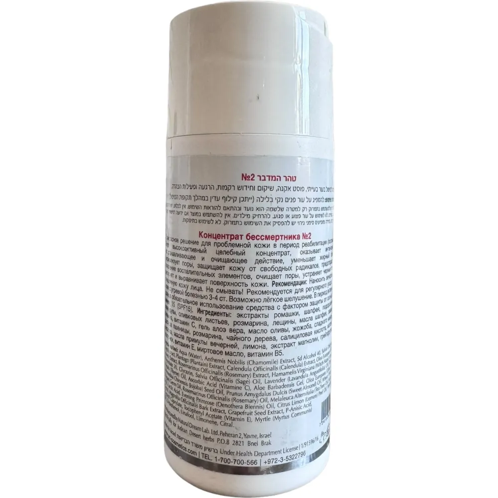 Смесь бессмертника Onmacabim Dm Tohar Hamidbar 2 комплекс с тщательно подобранными составляющими компонентами отлично заживляет, восстанавливает, устраняет покраснения, регенерирует и успокаивает кожу. Подходит для салонного и домашнего ухода, реабилитации после пластических операций.