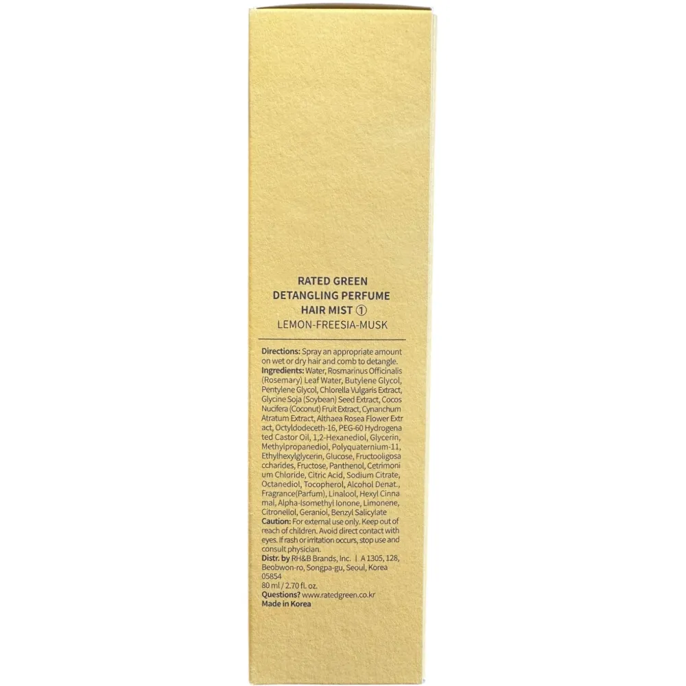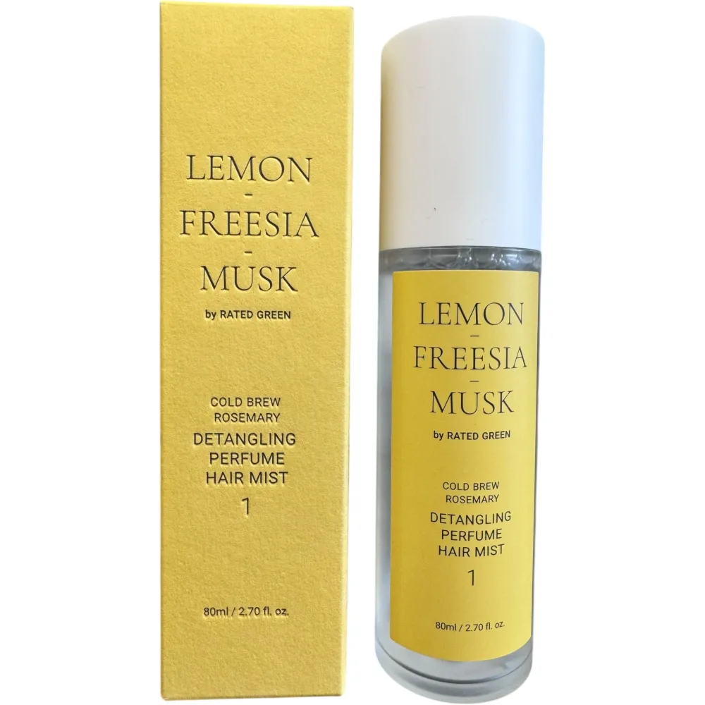 Парфюмированный спрей для волос Rated Green Detangling Perfume Hair Mist Lemon-Freesia-Musk. Окунитесь в атмосферу свежести и нежности с парфюмированным спреем от Rated Green! Аромат лимона, фрезии и мускуса освежает волосы, делая их послушными и сияющими.