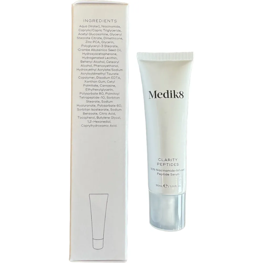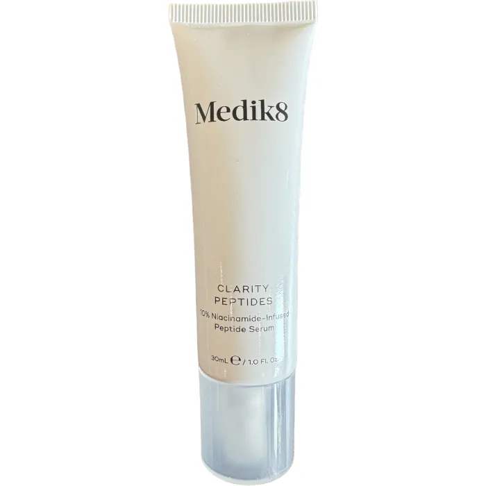 Medik8 Clarity Peptides Serum – сыворотка на основе пептида, который выравнивает тон кожного покрова, устраняет покраснения, глубоко очищает и успокаивает высыпания. Цинк регулирует работу сальных желез, подсушивает проблемные зоны. Обладает противовоспалительным действием, ускоряет выработку коллагена. Кожа приобретает естественную прозрачность.
