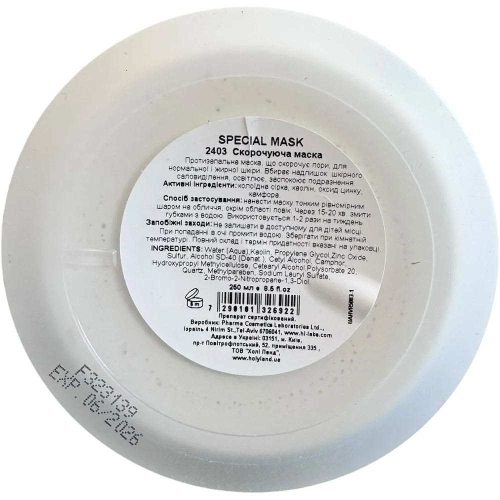 Регулярное использование Mask Special улучшит состояние угреватой, воспалённой ткани. Маска поможет восстановить дерму в период пост-акне (дренирует, устраняет уплотнения, полирует рубцовую ткань). Для лучшего эффекта подготовьте дерму, используя очищение от Holy Land. Также применяйте ежедневный уход для проблемной дермы и продукты локального использования.| Показания | Жирная и комбинированная кожа, расширенные поры, склонность к воспалениям и появлению комедонов, избыточное выделение себума. |