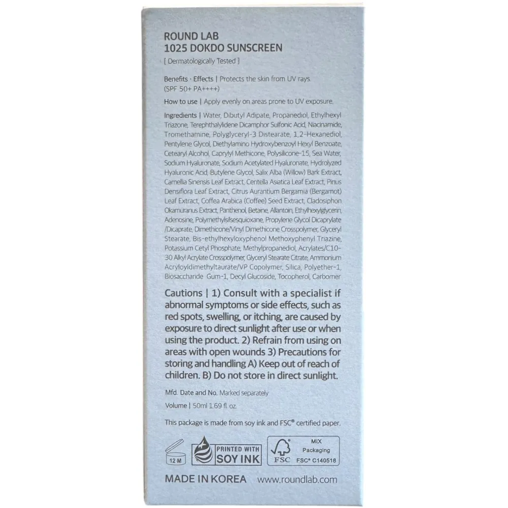 Round Lab 1025 Dokdo Sunscreen – это солнцезащитный крем SPF 50, который предназначен для защиты дермы от солнечного воздействия, а также увлажнения и смягчения. Еще он снимает воспаления с кожи, оказывает антиоксидантную защиту, профилактирует фотостарение, осветляет пигментные пятна и убирает сухость дермы.