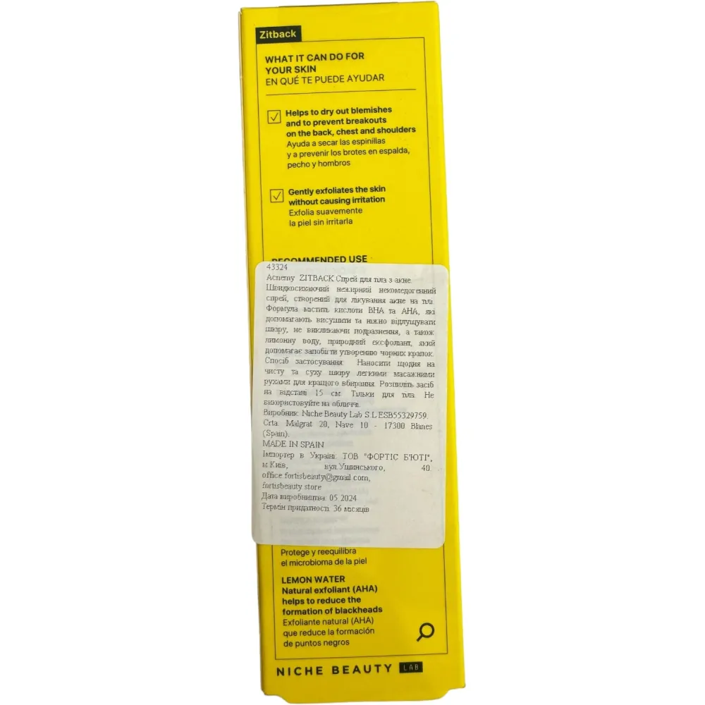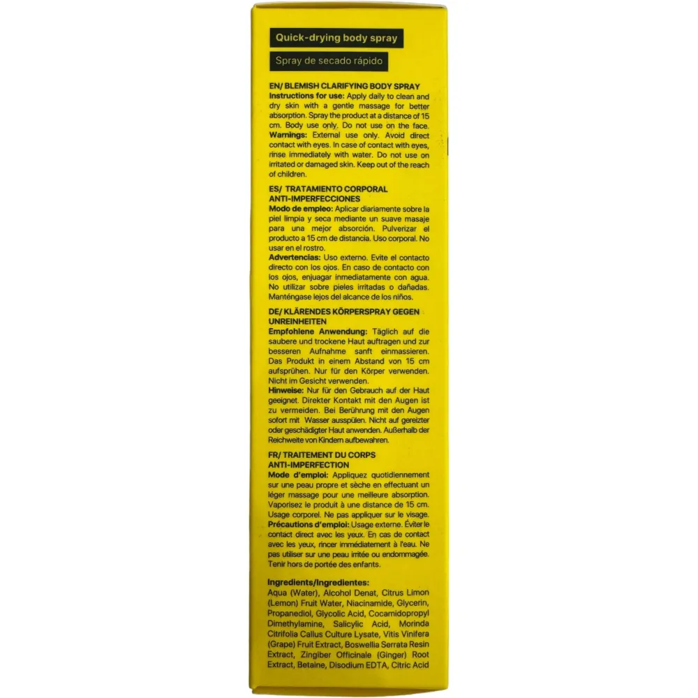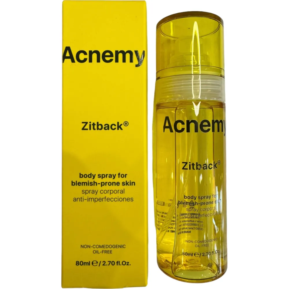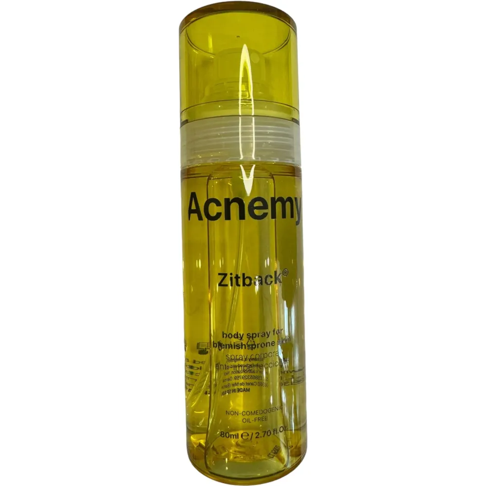 Спрей для ухода за кожей тела, склонной к акне, от Acnemy Zitback, мгновенно действует, попадая на поверхность. Средство полностью и быстро высыхает, не оставляя следов, мягко отшелушивает верхний слой, очищает поры и подсушивает прыщи. Кроме того, продукт вызывает раздражения.