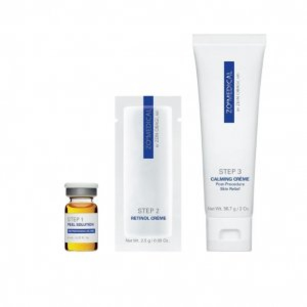3 шаговый пилинг осуществляется в косметологическом кабинете. На следующий день в домашних условиях наносится крем для лица с ретинолом и крем успокаивающий для лица. Набор включает 6 процедур для пилинга в индивидуальных упаковках. Каждая процедура для пилинга содержит: один Peel Solution, применяемый в условиях косметологического кабинета; 2 пакетика крема Retinol Creme (6%); один тюбик Calming Creme, аппликатор, информационный буклет.