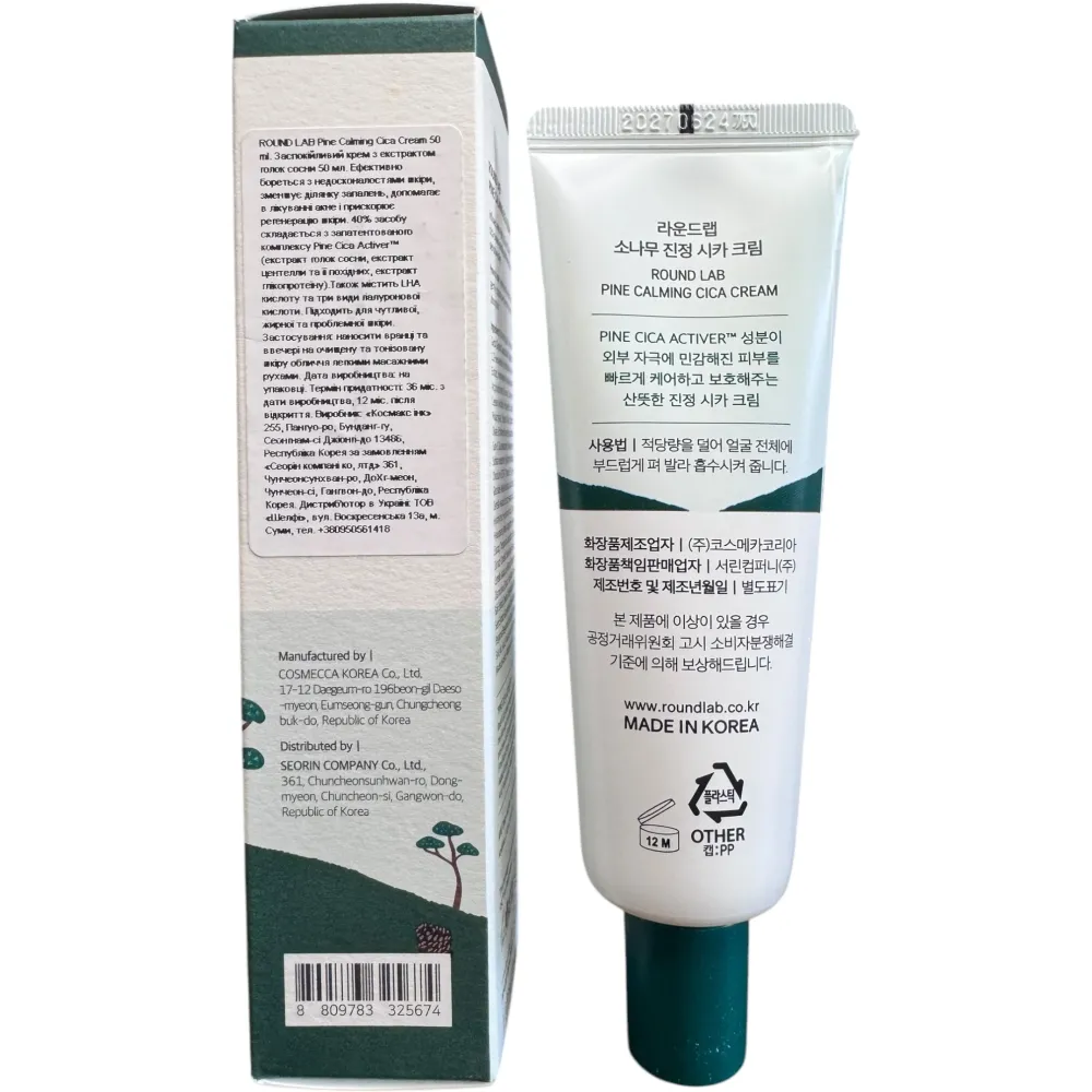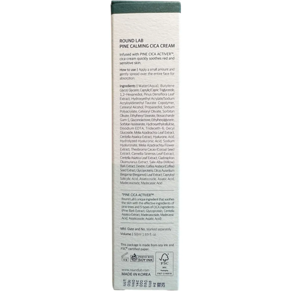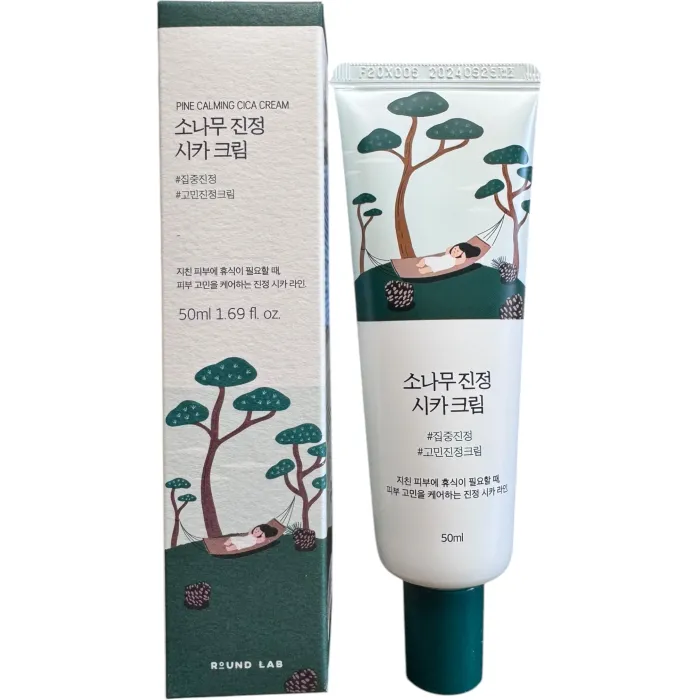 Round Lab Pine Calming Cica Cream – это успокаивающий крем с экстрактом сосны, который предназначен непосредственно для успокоения раздраженной дермы и снятия воспаления с покраснениями. Также данный уходовый продукт смягчает кожный покров, увлажняет и укрепляет его эпидермальный защитный барьер. Еще этот крем от Round Lab ускоряет процесс обновления кожи, деликатно отшелушивая ороговевший слой и, тем самым, выравнивая микрорельеф и тон. Также за счет этого активно вырабатывается новый коллаген, что делает кожу еще более эластичной и упругой. Крем непосредственно решает задачи в виде увлажнения и успокоения, устраняя при этом постакне и даже проявления купероза. Подходит для кожи всех типов, но более эффективен при жирном и комбинированном. Также он идеально подходит и для чувствительной дермы. Пользоваться можно от 18 лет и старше. Главная особенность крема в том, что он сохраняет естественный уровень влаги, а также заметно уменьшает жирный блеск кожи.