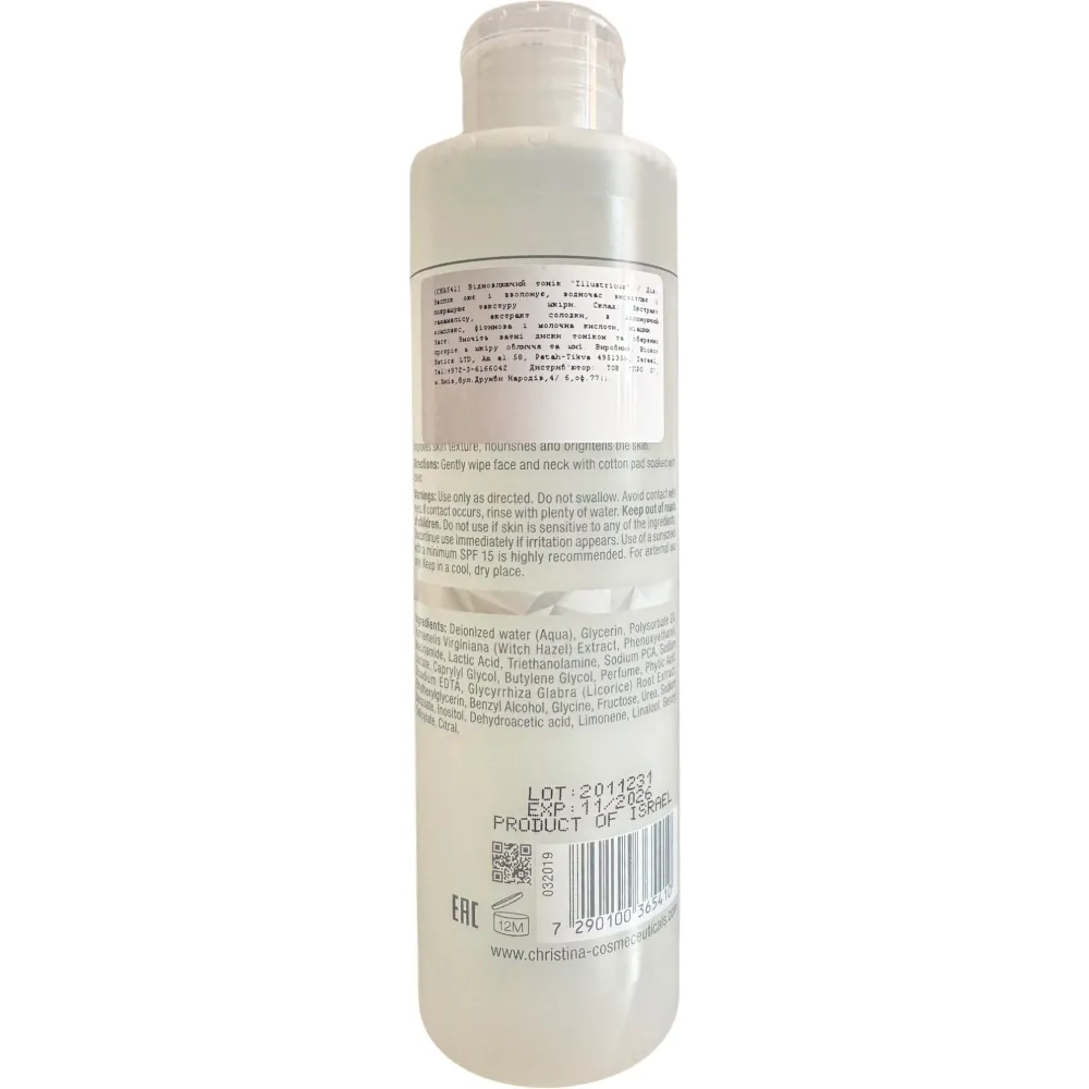| Действие | Мягко тонизирует и восстанавливает pH кожи, улучшает тон и сияние, способствует осветлению и выравниванию цвета лица. Подготавливает кожу к нанесению кремов и сывороток линии Illustrious. |