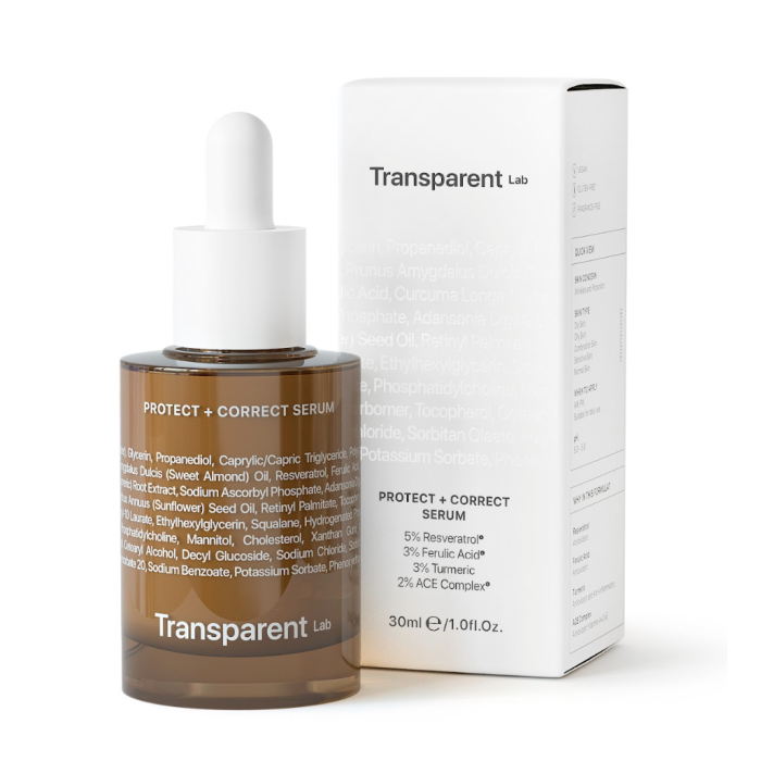 Transparent Lab Protect Correct Serum — антиоксидантна сироватка для захисту шкіри від стресу та вирівнювання тону. Містить вітамін C, ферулову кислоту й ніацинамід. Освіжає, зміцнює бар’єр і надає сяйво. Підходить для щоденного ранкового догляду, включно з використанням під SPF та макіяж.