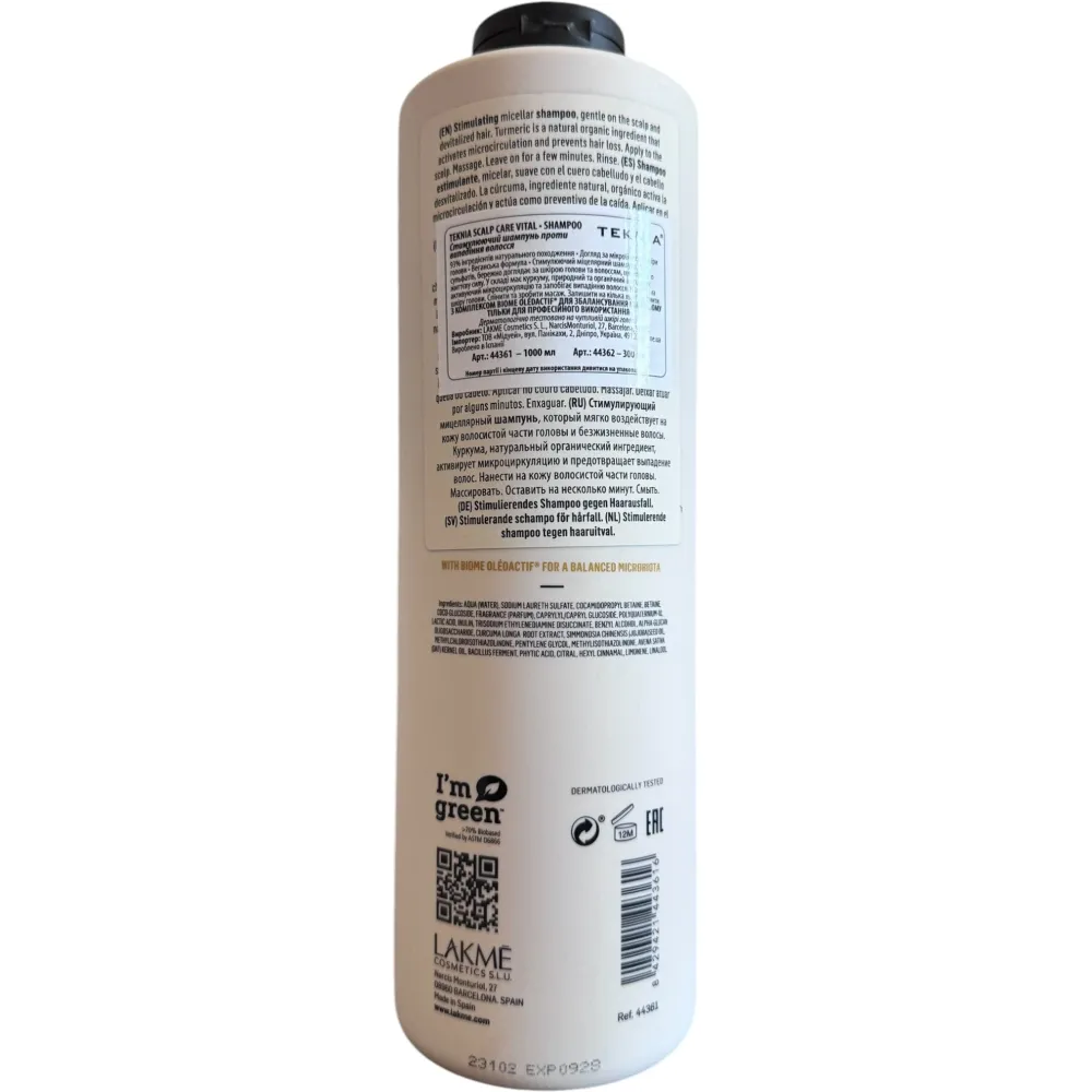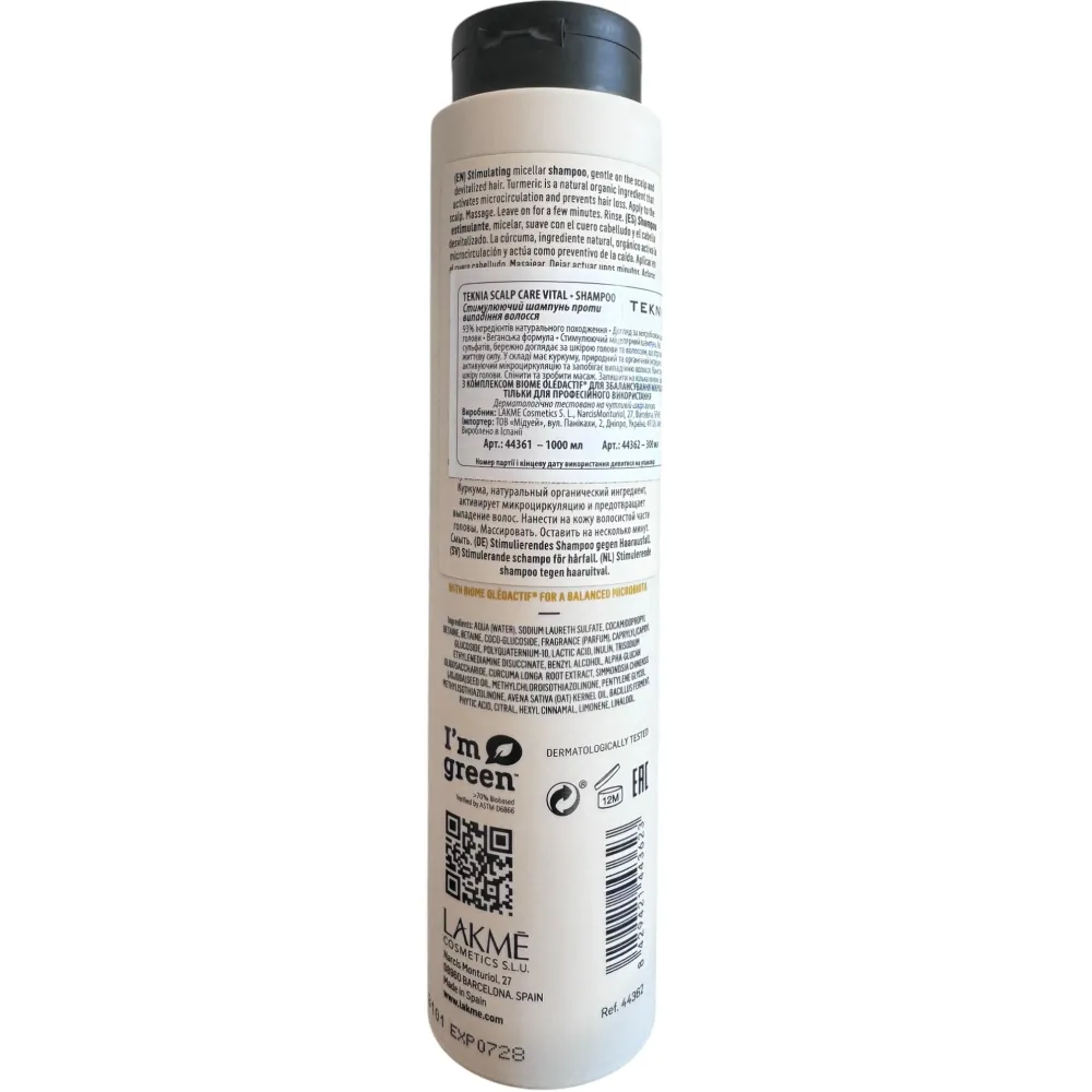 Шампунь Lakme Teknia Scalp Care Vital Sh - безсульфатний засіб, що запобігає випаданню волосяного покриву. Він забезпечує делікатне очищення від забруднень, при цьому посилюючи захисний бар'єр епідермісу голови. Сприяє стимуляції росту волосся і протидіє їх випаданню. Даний продукт створює сприятливе середовище для пожвавлення локонів, надає кожному волоссю текстуру та об'ємність.