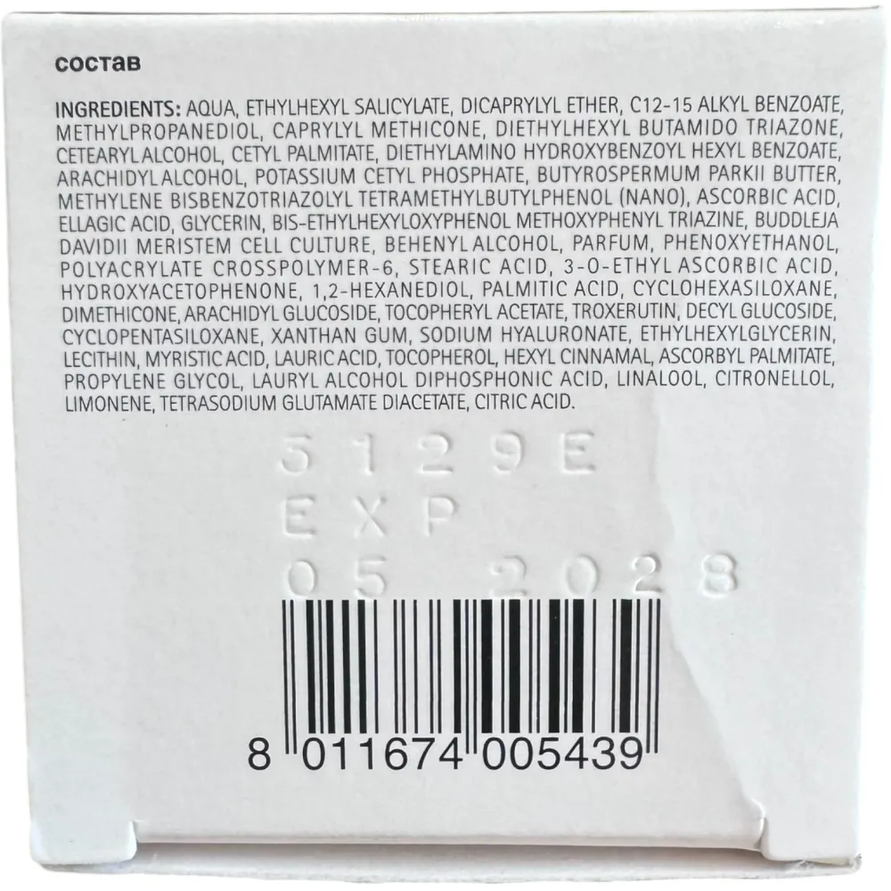 Склад: Native Complex (L-Аскорбінова + Елагова кислоти), Стовбурові клітини Будлею, стабілізована форма Вітаміну С (3-O-етил Аскорбінова кислота), Гіалуронат натрію, олія Ши, Лецитин, Троксерутін, Фотофільтри.