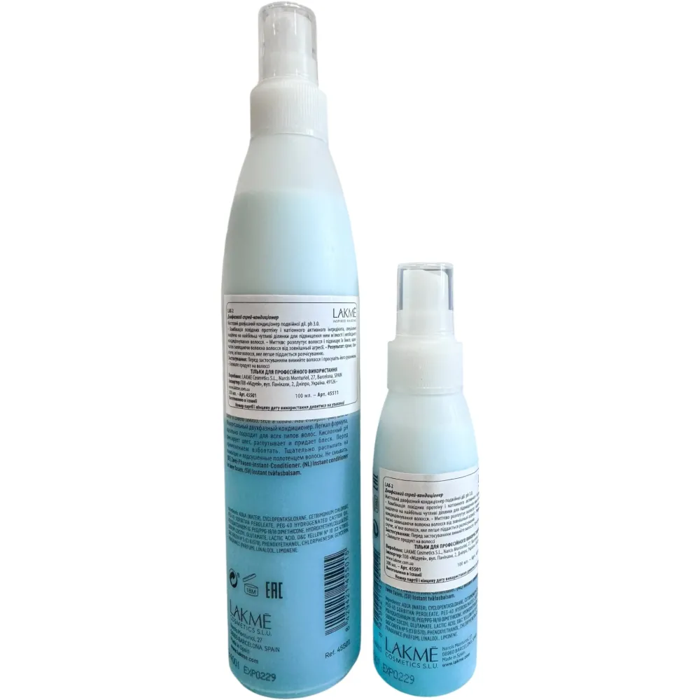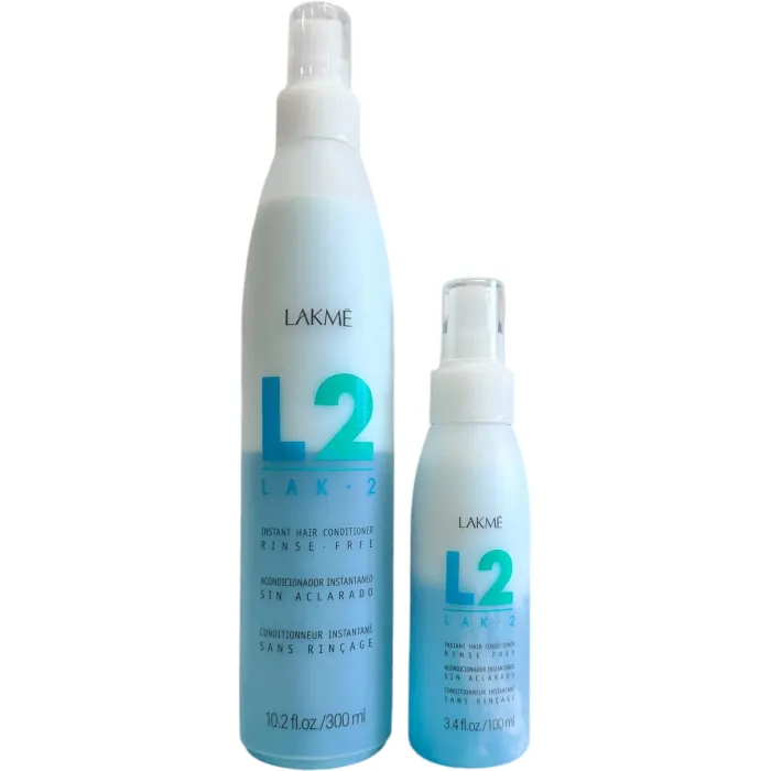 Кондиціонер двофазної миттєвої дії LAKME Lak 2 миттєво розплутує волосся та підвищує його блиск, захищаючи та зберігаючи волокно волосся від агресивних факторів навколишнього середовища. Комбінація гідролізованого протеїну та катіоноактивного компонента спеціально розроблена для впливу на найбільш чутливі ділянки. Кондиціонує і робить волосся м'яким без матового ефекту. pH фактор 3.0.