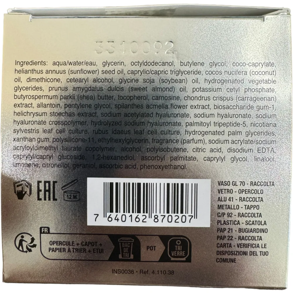 | Активні компоненти | Пептиди, стовбурові клітини рослин, гіалуронова кислота, ніацинамід, кераміди, антиоксиданти, вітаміни С та Е. |
