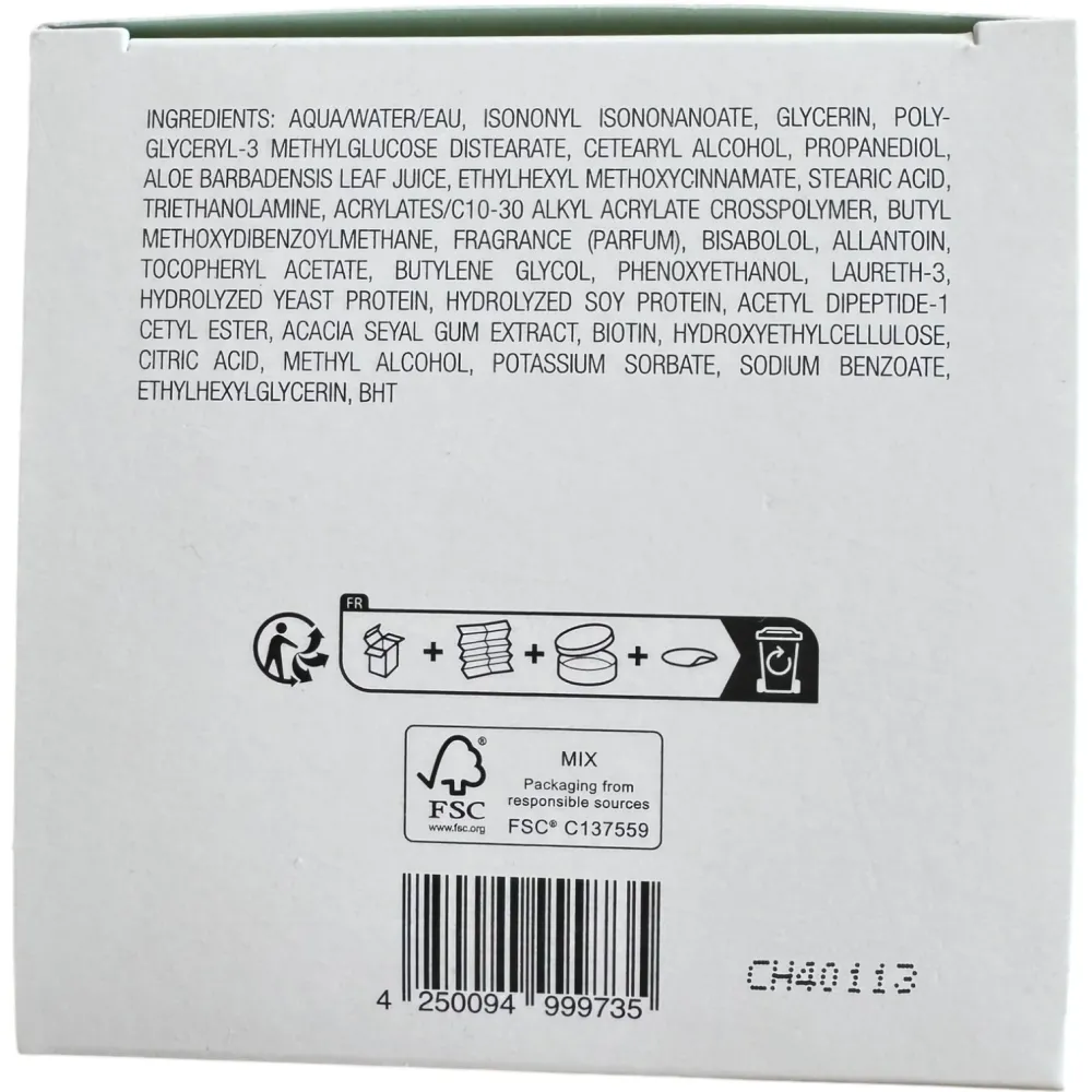 Повний склад: Deklaration nach INCI: Aqua/Water/Eau, Isononyl Isononanoate, Glycerin, Polyglyceryl-3 Methylglucose Distearate, Cetearyl Alcohol, Propanediol, Aloe Barbadensis Leaf Juice, Ethylhexyl Methoxycin , Butyl Methoxydibenzoylmethane, Fragrance (Parfüm), Laureth-3, Hydroxyethylcellulose, Acetyl Dipeptide-1 Cetyl Ester, Butylene Glycol, Acacia Seyal Gum Extract, Potassium Sorbate, Citric Acid, Benzyl Alcohol, Benzoic Acid, Dehydroacetic Acid, Hydrolyzed Yeast Protein, Hydrolyzed Soy Protein, Bisabolol, Allantoin, Tocopheryl Acetate