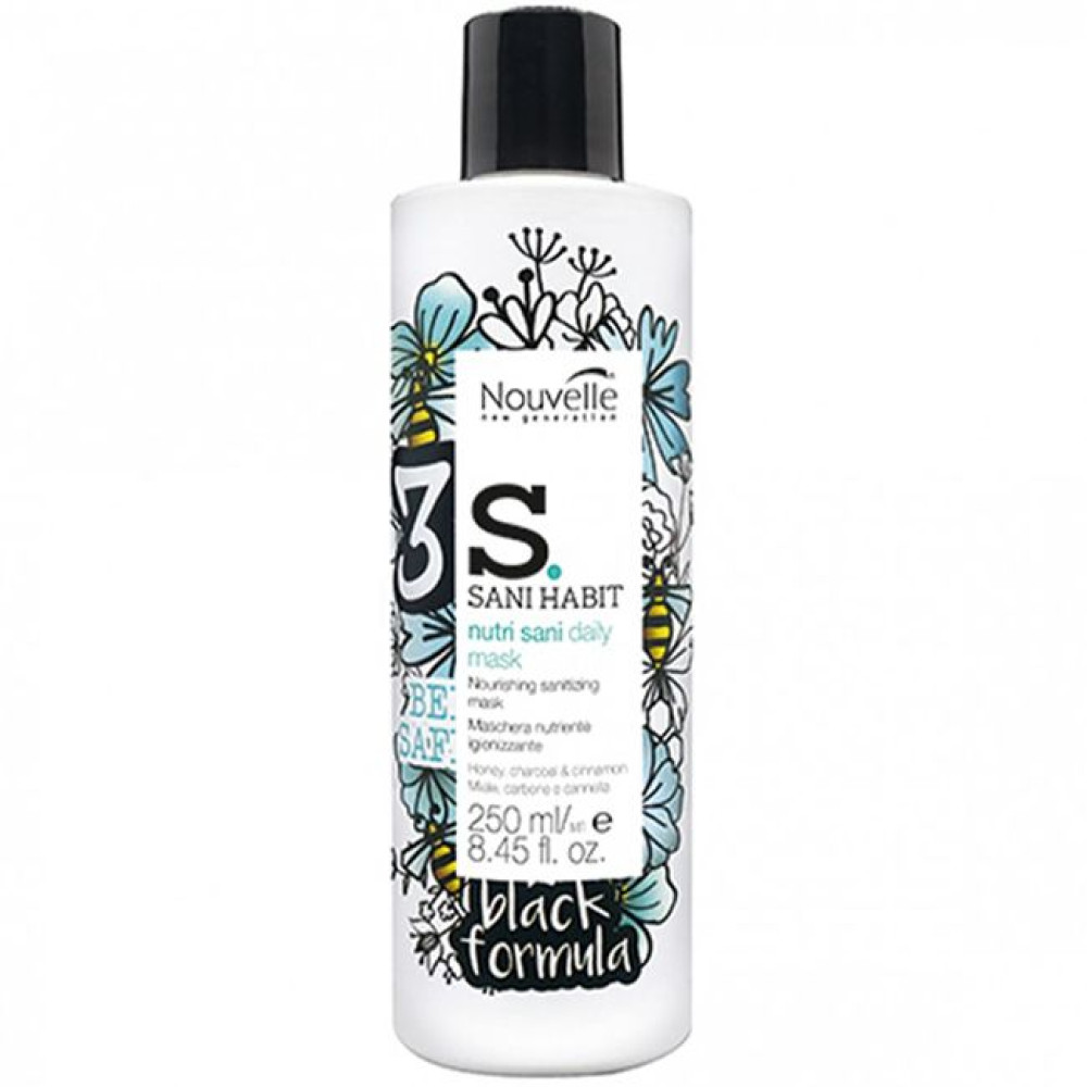 Nouvelle Sani Habit Daily Mask 250 мл – професійна живильна маска для волосся від італійського бренду. Маска володіє дезінфікуючими та кондиціонуючими властивостями. Підходить для щоденного застосування для сухого, пошкодженого та ослабленого волосся. Спеціальна формула з каштановим медом та ефірною олією кориці має антибактеріальний та протимікробний ефект, деревне вугілля у складі абсорбує та видаляє залишки забруднень та себуму, гліцерин зволожує та пом'якшує шкіру голови та волосся. Об'єм 250 мл. Склад: