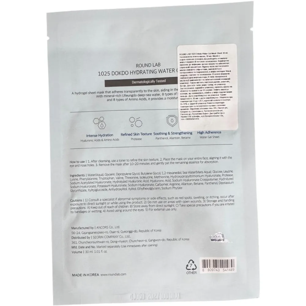Round Lab 1025 Dokdo Water Gel Mask - гелева зволожуюча маска для тих, кому не вистачає води у шкірі. Ця маска – як холодний компрес після спекотного дня. Гелева текстура миттєво охолоджує, заспокоює та повертає шкірі відчуття «насиченості». А головне — жодної липкості, стягнутості чи перевантаження.