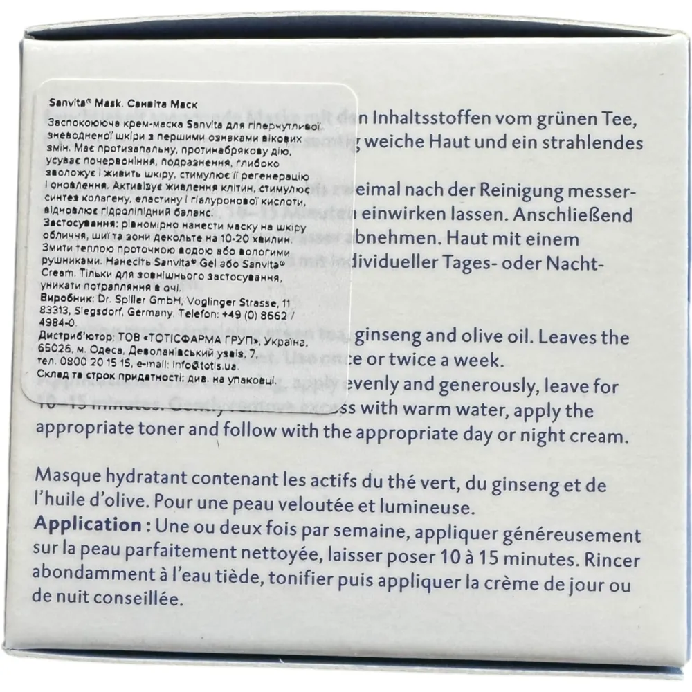 - Німецька маска від Dr. Spiller, призначена для чутливої шкіри, повністю виготовлена на натуральній основі. Дана крем-маска рекомендована для застосування людям зпідвищеною чутливістю шкіри, а також тим, хто хоче позбутися дрібних мімічних зморшок. Це багата на вітаміни С і Е маска, яка має антивіковий ефект. Склад засобу включає велику кількість колагену. Маску роблять на основі екстрактів зеленого чаю та жошенку.
