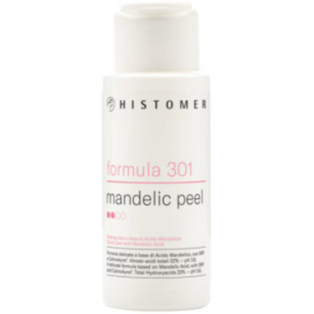 Пілінг з мигдальною кислотою Histomer Formula 301 Mandelic Peel. Делікатний хімічний пілінг на основі мигдальної кислоти, ідеально підходить для чутливої, куперозної або запальної шкіри. Має м’яку відлущувальну та антисептичну дію, покращує текстуру шкіри, вирівнює тон, звужує пори та бореться з першими ознаками старіння. Підходить для всіх типів шкіри, включаючи чутливу.