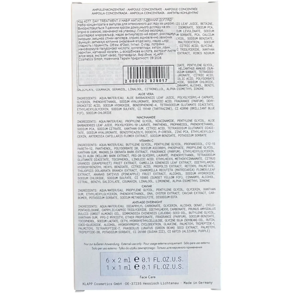 Набір концентратів у ампулах для інтенсивного догляду за шкірою. Концентровані сироватки шкіри Klapp в ампулах призначені для нанесення поверхні до шкіри, родзинки сучасної косметичної допомоги. Спеціальна форма нанокапсуляції активних речовин забезпечує глибоке проникнення та тривалий ефект концентратів підвищення шкіри Klapp на рівні шкірної матриці епідермісу - саме там, де утворюються біологічні процеси відновлення клітин та функцій шкіри. Використання ампул рекомендується 2-3 рази на тиждень для основного продукту по догляду за шкірою. Візуальний ефект спостерігається після першого застосування, а регулярне використання забезпечує високу постійну ефективність.