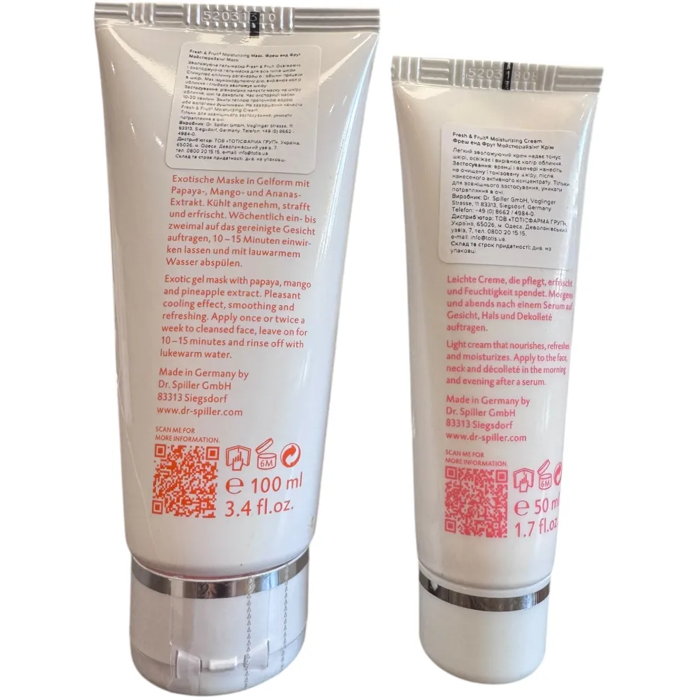 • Освіжаюча маска Fresh & Fruit Mask (50 мл) • Легкий зволожуючий крем Fresh & Fruit Moisturizing Cream (50 мл) • Подарункова косметичка Dr. Spiller |