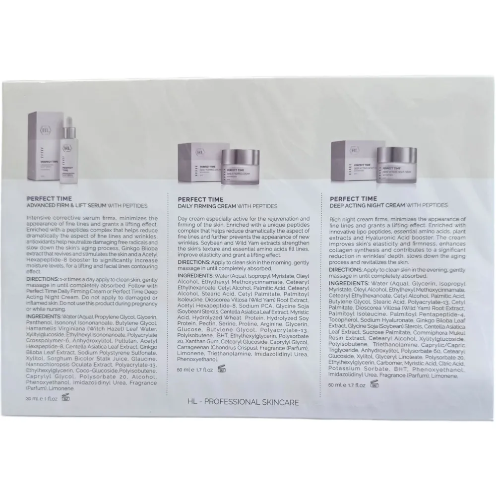 • Perfect Time Serum 15 мл – сироватка з пептидами для зміцнення та ліфтингу шкіри. • Perfect Time Cream 15 мл – крем для підвищення щільності шкіри та зменшення зморшок. • Perfect Time Eye Cream 15 мл – крем для контуру очей, зменшує набряклість і темні кола. |