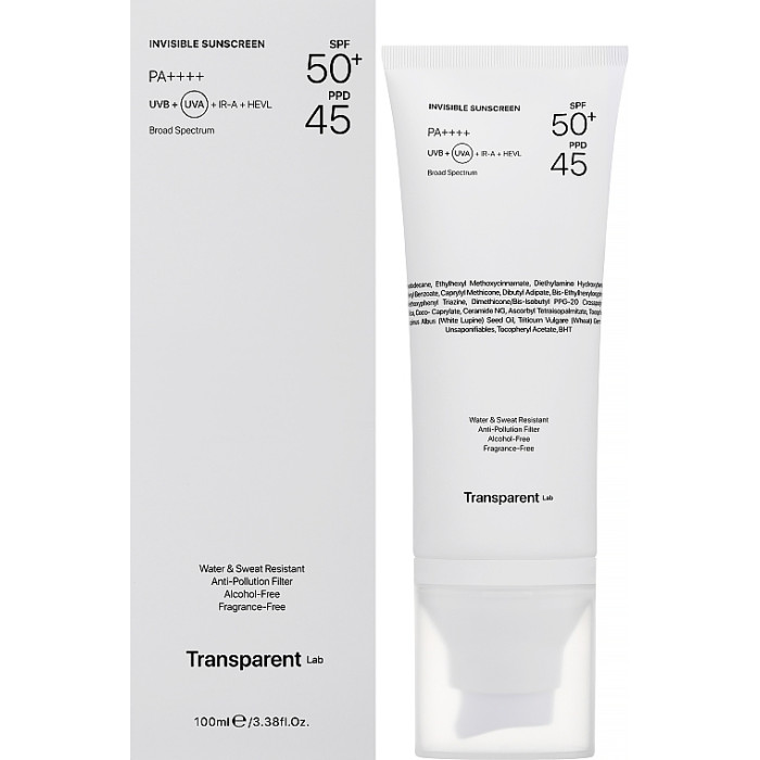 Transparent Lab Invisible Sunscreen SPF 50+ — невидимий сонцезахисний крем із легкою текстурою та високим рівнем захисту від UVA/UVB. Не залишає білого нальоту, не блищить і не забиває пори. Підходить для всіх типів шкіри, включно з жирною та чутливою. Чудово лягає під макіяж і підходить для щоденного використання.