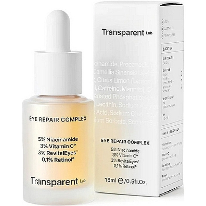 Transparent Lab Eye Repair — нічна сироватка для шкіри навколо очей, що відновлює, зменшує набряки та бореться зі зморшками. У складі: ретинол, пептиди, ніацинамід і гіалуронова кислота. Зміцнює, зволожує та освіжає погляд. Підходить для всіх типів шкіри.