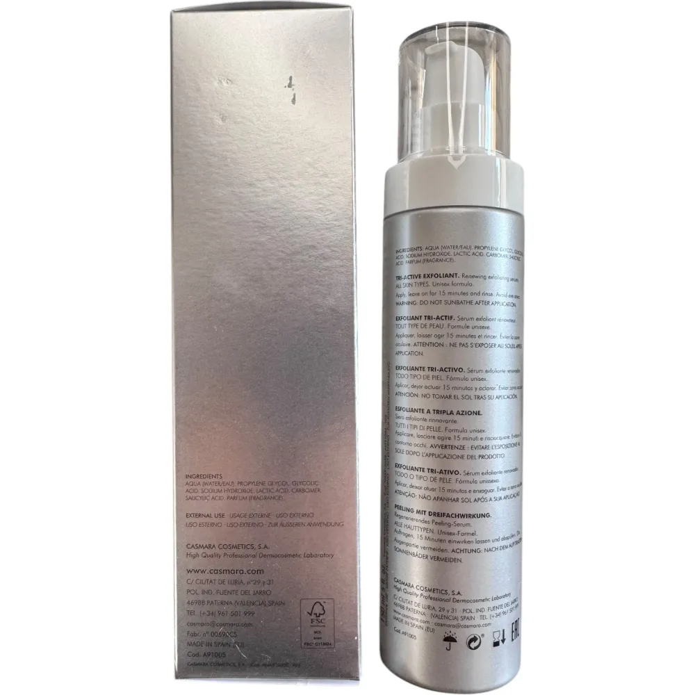 - Має відлущувальну дію на трьох рівнях: на найглибшому рівні ексфоліація досягається за рахунок гліколевої кислоти (8%), на проміжному – молочної кислоти (2%) (більший розмір молекул), а на поверхневому рівні – саліцилової кислоти (0,5%) ) (Найбільша за розміром молекула).