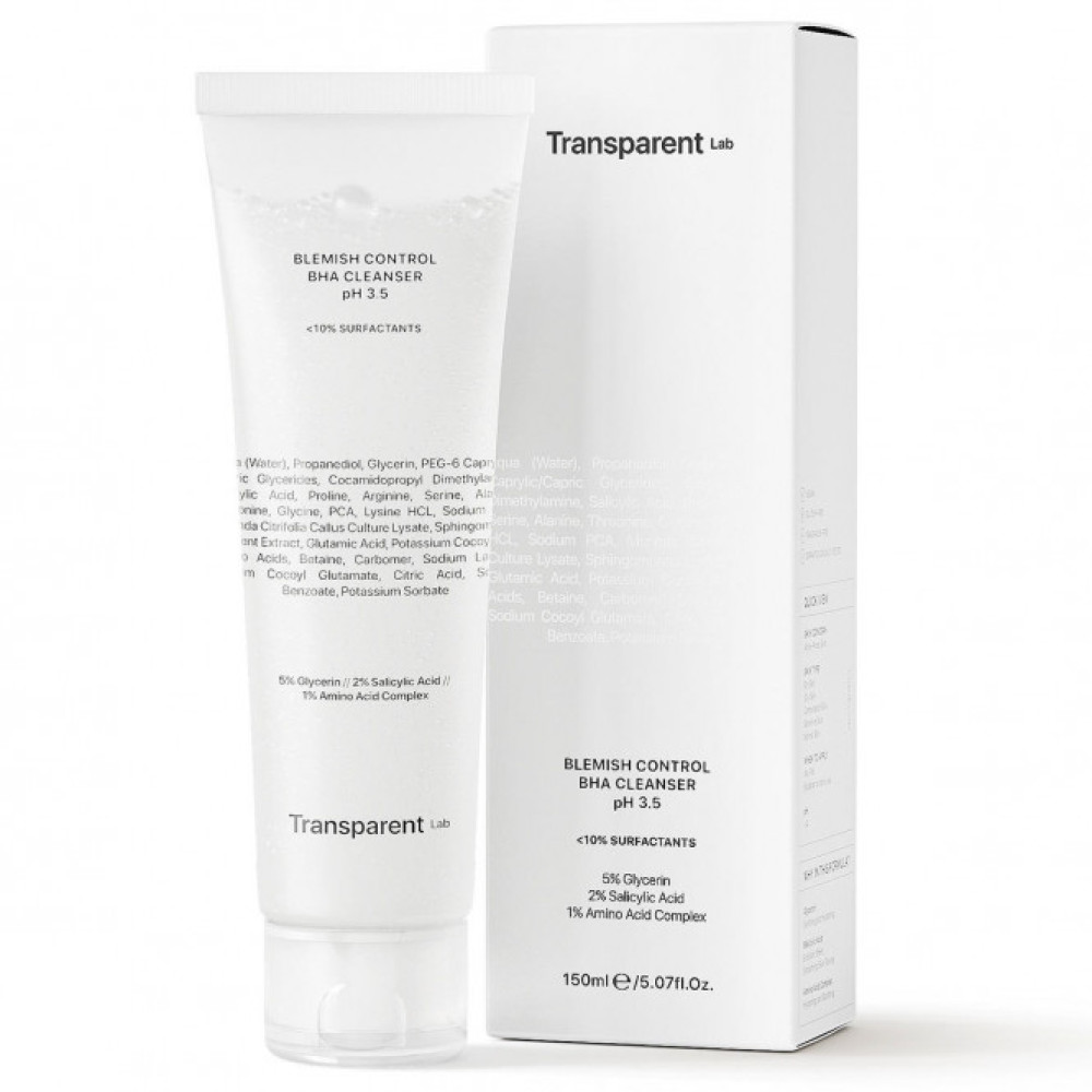 Очисник Blemish Control BHA Cleanser, розроблений компанією Transparent Lab для вікової шкіри, орієнтований на боротьбу з акне. Очищаючий препарат є ефективним при виникненні запальних процесів, комедонів та інших естетичних недоліків шкірного покриву. В основі гелю для вмивання лежить саліцилова кислота, яка у поєднанні з іншими активними елементами глибоко проникає у пори для ефективного очищення.