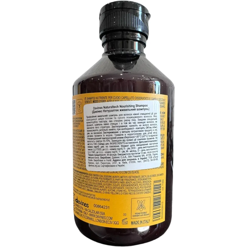 | Рекомендація | Нанести на вологе волосся, спінити масажними рухами, залишити на 1–2 хвилини та ретельно змити. За потреби повторити. Рекомендується комбінувати з кондиціонером та маскою лінії **Davines Naturaltech Nourishing**. |