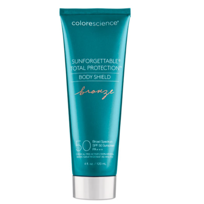 Нежирний і легкий сонцезахисний крем для тіла багатий на антиоксиданти. Забезпечує 100% мінеральний захист SPF 50 від UVA/UVB-променів та стрес-факторів навколишнього середовища. Водостійка, ідеальна для щоденного застосування. Він створений для того, щоб ідеально вписатися у ваше життя! Активні 100% нехімічні агенти Sunforgettable Total Protection Body Shield – це більше, ніж просто SPF. Вони забезпечують повноцінний невидимий щоденний захист від шкідливих факторів довкілля. Насичений бронзовий відтінок, який ідеально підходить як власникам темніших відтінків шкіри, так і для надання ефекту засмаги світлим тонам шкіри.