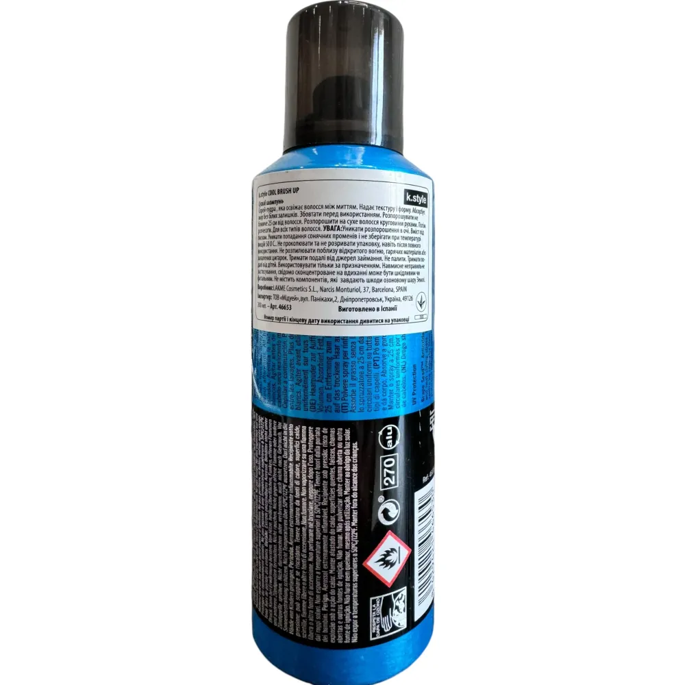 Сухий шампунь Lakme Cool BRUSH UP – спеціальний продукт, який бездоганно відновлює привабливий та доглянутий вигляд волосся у проміжках між миттям. Підходить для додання свіжості локон будь-якого типу. Збалансована формула наділена освіжаючим ароматом, м'яко проникає у структуру локонів, нейтралізуючи залишки себуму. Головна ефективність сухого шампуню покладається на Grape Seed Antioxidant Complex. Цей інноваційний комплекс поєднав антиоксидантні властивості виноградних кісточок та вітаміну Е. Вони вибудовують природний захисний шар від агресивної дії вільних радикалів на структуру волосяних волокон. Отримане захисне тло оберігає також від зміни кольору, впливу термоприладів, УФ-променів.