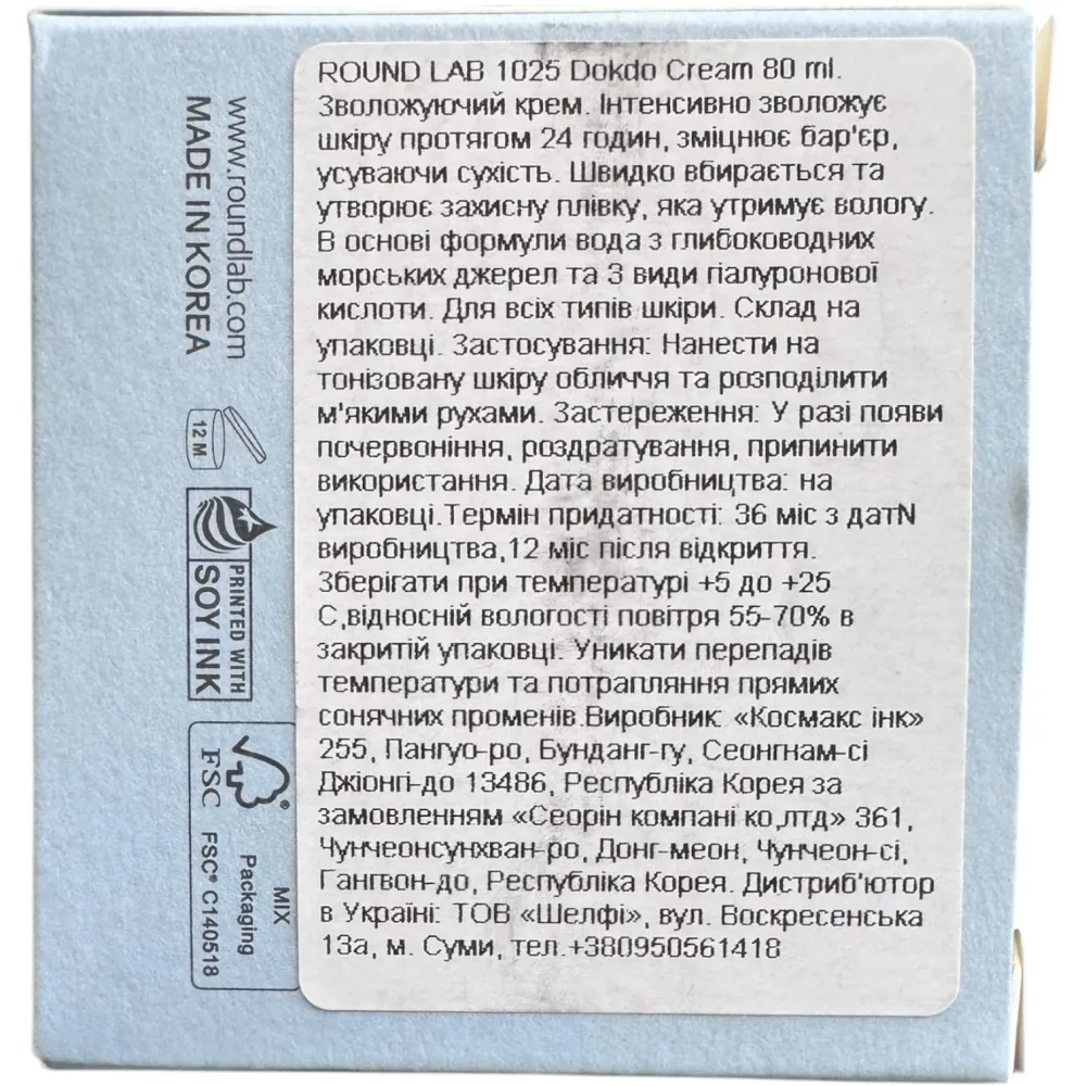 Зволожуючий крем із морською водою Round Lab 1025 Dokdo Cream – це зволожуючий крем із морською водою, який призначений для живлення шкіри та збереження в клітинах необхідної вологи. Також цей догляд від Round Lab надає шкірі більшої еластичності, м'якості і гладкості. Ще цей продукт відновлює захисний бар'єр шкіри, а також чудово заспокоює її, знімаючи роздратування та запалення. Даний зволожуючий крем безпосередньо вирішує завдання у вигляді збереження вологи в дермі та активної регенерації клітин, що помітно розгладжує та відновлює шкіру загалом.